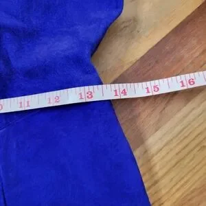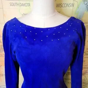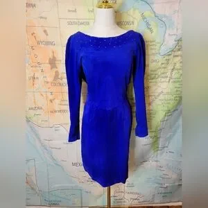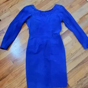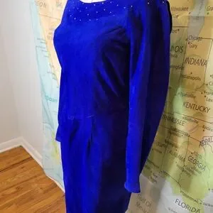 Vintage 1980s Suede Electric Blue Knee Length Dress With Rhinestones Size M