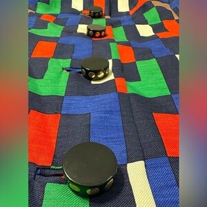 Bold block design with vibrant colors. Button-up front. Chic three-quarter sleeves.