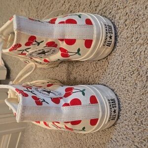 White Converse high-tops featuring a vibrant cherry pattern. Red cherries with green stems add a playful touch.