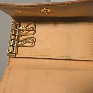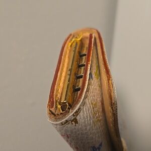 Preloved corner wear, color transfer inside, minor hardware tarnish, light fading on canvas (see photos)
