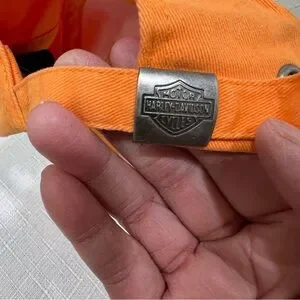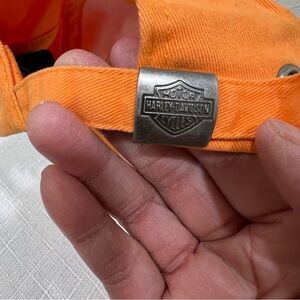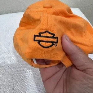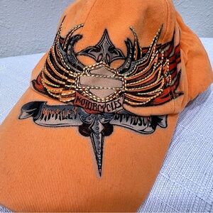 Orange Harley Davidson Hat with winged logo. Embellished with rhinestones and embroidery. Adjustable back. One size fits most.