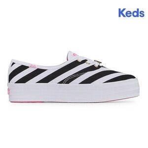 American style icon for a capsule collection that's as fun as it is fashionable. Our pointed-toe platform sneakers draw inspiration from Barbie's past & remain on-trend today. Crafted from black & white striped canvas in a V-shape reminiscent of Barbie's original 1959 swimsuit, this lace-up shoe offers the height of a heel, the cushioning of a sneaker, & the chic, feminine appeal of a pointed toe (without the pinch). We've unearthed this chic silhouette from the archives and elevated it on a lightweight 1-inch platform sole, complete with a removable golden Barbie 'B' lace tag. Add in a soft footbed (in Barbie's signature pink, of course), & you've got an overall premium look that's both retro and modern. Elevate your casual outfits, pair them with party attire, or bring some chic to your workday – the Barbie x Keds Point does it all.