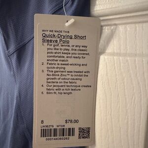 New with tags Lululemon Quick-Dry Short Sleeve Polo in light blue. Purchased for Golf / Tennis and no longer play due to knee injury!