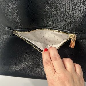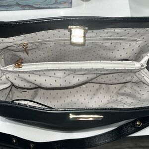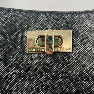 Black “Posh Hobo Bag” by Vanessa Williams. Soft Faux Saffiano Leather. Gold hardware. Turnlock closure. Zip pocket in the middle creating compartments on each side with a zip pocket on one side and slip pockets on the other.