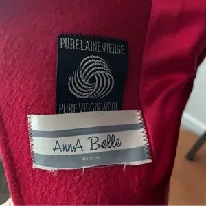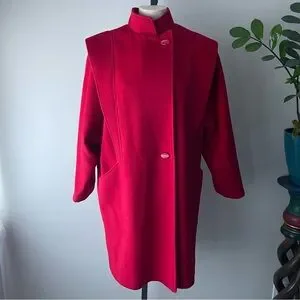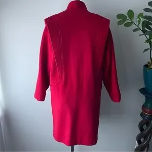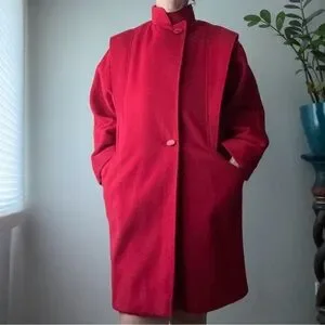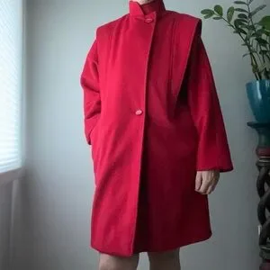 Elegant ruby red cape with a modern design. Features a high collar and button accents. Perfect for stylish outings.