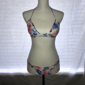 This bikini is 90% polyester and 10% spandex and hand wash only. This bikini does run small! The size chart is in the photos for all Boutique items. Again this bikini does run small!