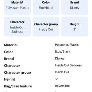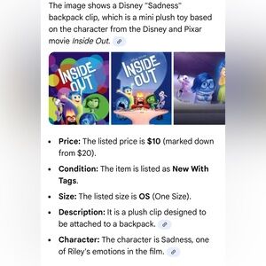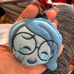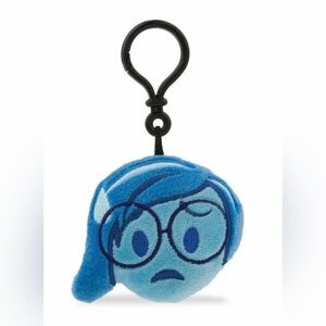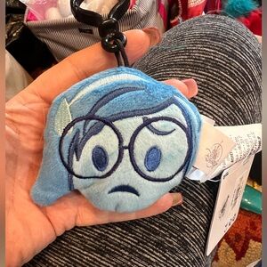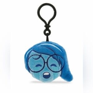 Description: plush backpack clip, Sadness blue character from Inside Out, reversible face with two different expressions