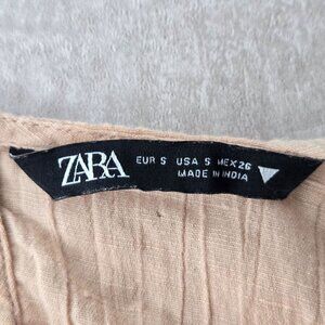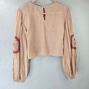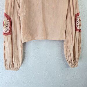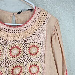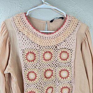 Zara Crochet Crop Top S Light Pink Linen Boho Cottage Hippie Long Sleeve Shirt