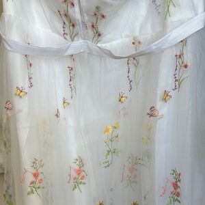 Elegant white dress with colorful floral embroidery, perfect for any occasion corset fitted bodice whit maxi skirt covered with embroidered tulle