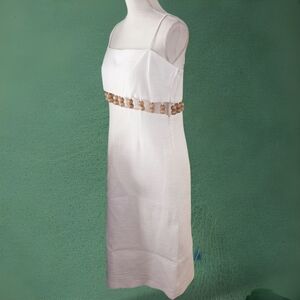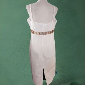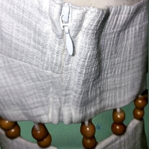 This elegant white spaghetti strap dress features stylish wooden accents at the waist, perfect for any occasion. Its simple yet sophisticated design makes it a versatile addition to your wardrobe.