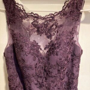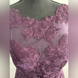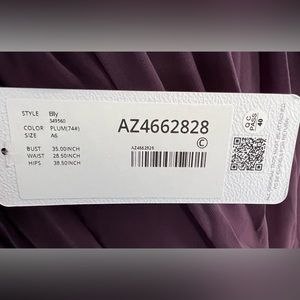 It's a beautiful, comfortable dress, and has a built in bra. I saved the tag along with the bag and sash (which you will receive). The color is Plum and size A6. No alterations have been done to this dress. It has a minor defect on the back next to the zipper (see photo) it came to me this way and was not disclosed. However, you can't tell when it is on due to the natural flow of the dress, especially with the sash. I wore it once in a wedding and received many compliments. It really is quite lovely. I'm hoping to help another gal out who might be a bridesmaid by buying second hand versus wasting money on a new dress. It's ready to be re-worn.