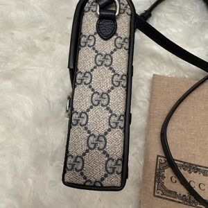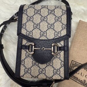 Elegant Gucci crossbody with signature monogram. Black leather trim and adjustable strap.