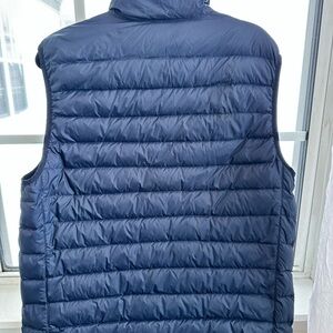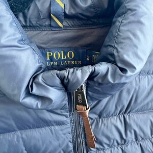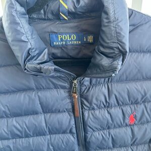 Navy puffer vest by Ralph Lauren. Features yellow accents. Ideal for layering.