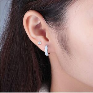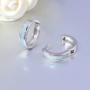 One Set of - 14K White Gold Plated Silver Tone Mini Hoop Huggies Hinged Snap Latch Back Closure Earrings Embellished with 14mm x 2.5mm 100% Genuine White Fire Opals