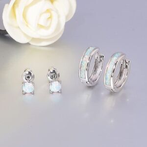 14K White Gold with Genuine White Fire Opal Huggie and Stud Earrings Set of 2