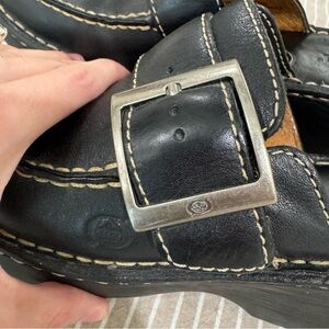Born clogs, Born buckle clogs, Born leather mules, black leather clogs, comfort slip-on shoes, platform clogs, chunky clogs, women’s comfort footwear, work-appropriate shoes, cushioned leather mules, size 6 clogs, slip-on leather shoes, Born shoes women.