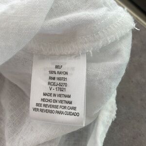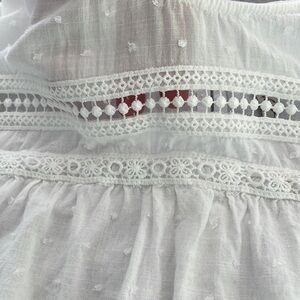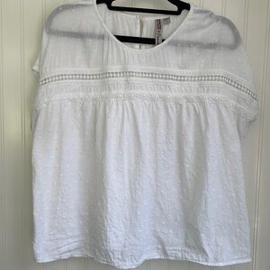 In excellent used condition! Cute boxy fit cap sleeve semi sheer white top with Swiss dots and crochet details.