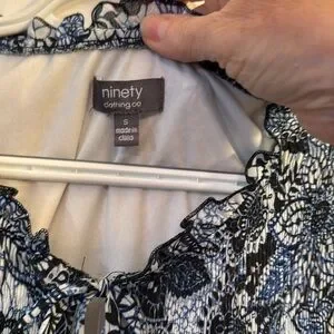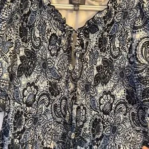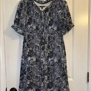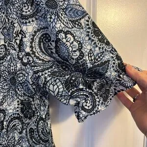 Stylish dress with a floral pattern. Features a mix of black and white colors. Fully lined and smocked size but would fit medium