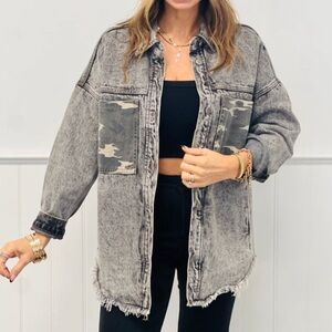 Elevate your style with this chic distressed gray denim jacket. Perfect for layering, this versatile piece adds a trendy touch to any outfit.