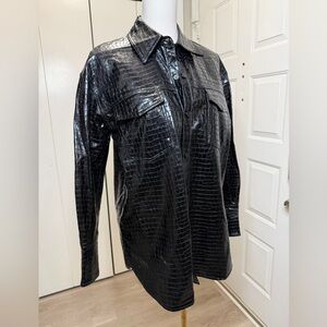 Stylish black shirt jacket with crocodile pattern. Perfect for a modern look.
