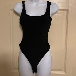 Features/Description: Black bodysuit. Scoop neckline with low scoop back. Back of the bodysuit is a thong. Bodysuit buttons in the crotch area.