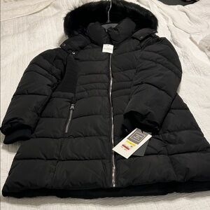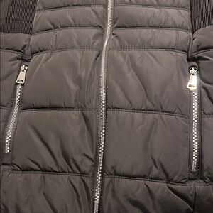 Keep warm and stylish with this black puffer jacket featuring a cozy faux fur hood and silver zippers. Perfect for chilly days. Just above knee-length on a person 5’9”. Pet-free, smoke-free home. Kept in original plastic bag.