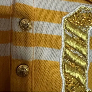Polo style dress in yellow with white stripes. Drop tie waist and two front pockets. God snap buttons. Embroidered logo with subtle sequins detailing. This dress is soft and comfortable. 60% cotton 40% polyester. Hand wash.