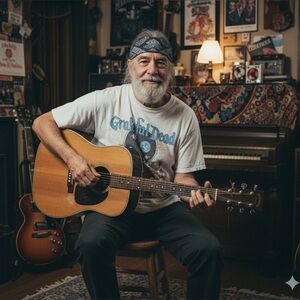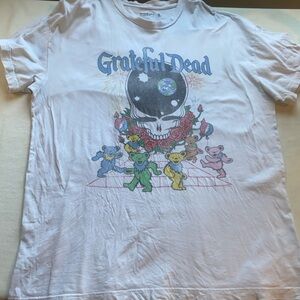 Features Grateful Dead logo with dancing bears. Vibrant colors on a white tee. Fun and iconic design.
