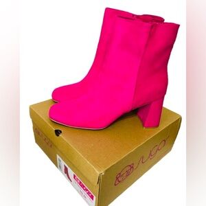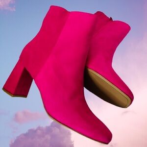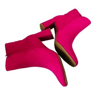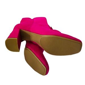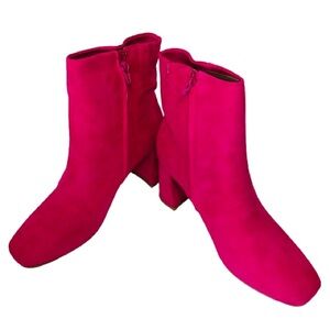 Step out in style with these vibrant pink ankle boots. Perfect for adding a pop of color to any outfit. Heel ht. 3” block heel, Medium width, zipper closure, memory foam comfort insole, Manmade fabric upper, lining and sole, square toe, spot clean. Size 10 M, Pink Fuschia Micro