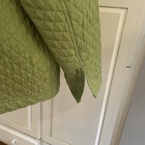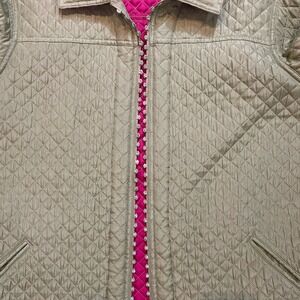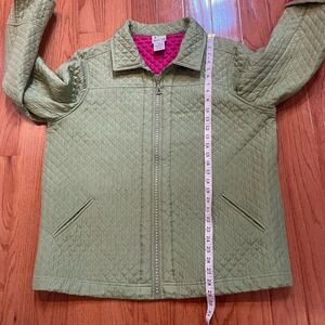 It's in excellent condition and looks like it's never been worn. The Quacker Factory Quilted Jacket in size 1X is a stylish and elegant outerwear piece for women. Made from 100% silk with a polyester lining, this green and pink jacket features a quilted design, long sleeves, and a full zip closure. Perfect for the winter, fall, and spring seasons, this lightweight jacket is adorned with embellishments and offers a comfortable fit. Designed by the brand Quacker Factory, this classic and colorful jacket is a must-have for any fashion-forward woman looking to add a touch of artistry to her wardrobe.
