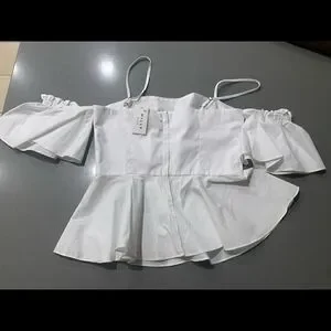 A flirty, frilly top to refresh your wardrobe. Square neck. Camisole straps. Cold shoulders. Elbow-length bell sleeves. Back button and zipper. Peplum hem. Lined. Cotton/nylon/spandex. Dry clean. Made in USA. SIZE & FIT. About 22" from shoulder to hem. Model shown is 5'10" (177cm) wearing size 4.