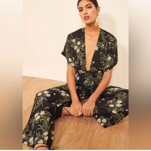 Reformation Lemongrass jumpsuit . Black with florals throughout, v neck, wide leg, cinched waist