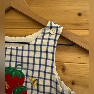 Vintage Kelly’s Kids Size 7 Blue White Gingham Strawberry Bee Tank Dress Summer