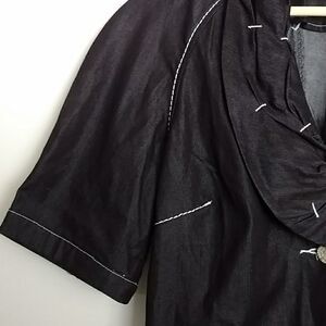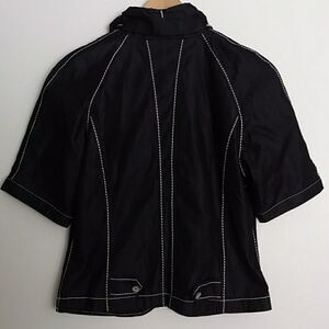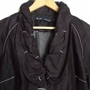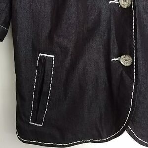 Blue Willi's Denmark "Life" black 2-button blazer with white stitching/details. (**Jacket is very dark blue, almost black.) Size Small. 74% cotton, 26% polyester. Front has 2 pockets & collar uniquely shaped 3-dimensional rounded collar. Added darts on front create a feminine shape. This jacket is adorable & in great shape!!