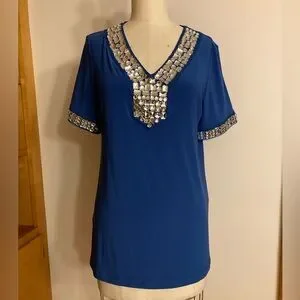 CSC Studio royal blue women's top with stunning crystal/diamond embellishments at the v-neck and sleeves.