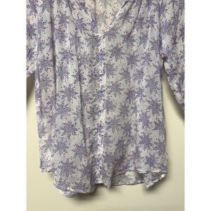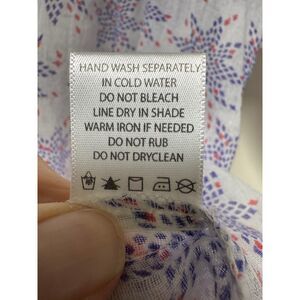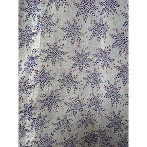 Beautiful sheer peasant style blouse with a blue and red abstract star print. V-neck design. Relaxed, casual fit. 100% cotton.