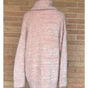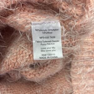 Show Me Your Mumu Fatima Turtleneck Sweater in a soft, fuzzy pink knit. This cozy and stylish sweater features a comfortable turtleneck and a relaxed fit, perfect for layering during colder months. The beautiful pink hue adds a pop of color to any outfit. Excellent pre-owned condition.