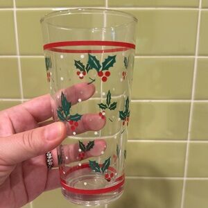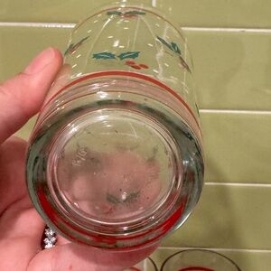 Set of holiday-themed glasses featuring a holly design. Perfect for festive gatherings.