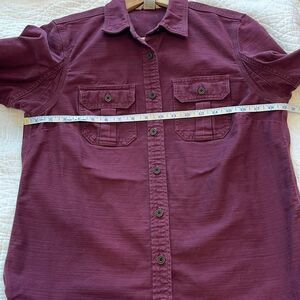 This Duluth Trading Co button down is great for outdoors activities and casual wear - definite Carhartt vibes! Burgundy fabric that's perfect for fall and brass colored metal buttons down front and on pockets. Two stretch cotton vents on back between shoulder blades for comfort and movement. Also stretch cotton under arms - great details on this shirt!