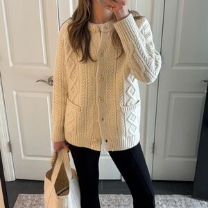 A chunky cable knit cardigan made from soft merino wool with a classic fisherman-inspired design.