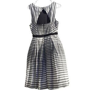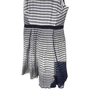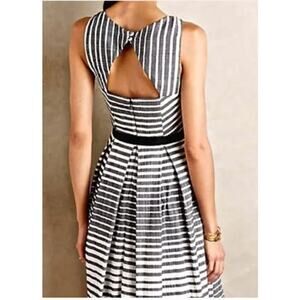 Size 10 Eva Franco Saybrook striped fit & flare dress from Anthropologie. Dark gray & white stripes with black waist detail. Back cutout with two top buttons and zippered closure. Pleated skirt. Made in USA. Fully lined.
