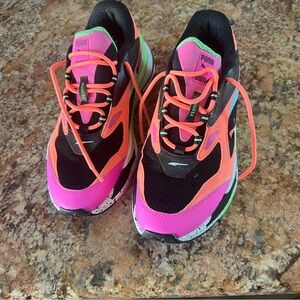 Dynamic Puma shoes with vibrant pink and orange hues. Features sleek black details and bold design.