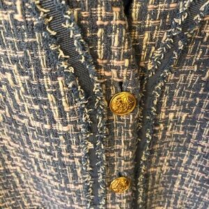 Calling all blue/white lovers! Traditional blue/white tweed blazer with gold button details. Perfect for elevating any look. Versatile for both work and casual wear.I love this with a white tee, jeans, loafers and pearls! ๐๐ค๐๐ค