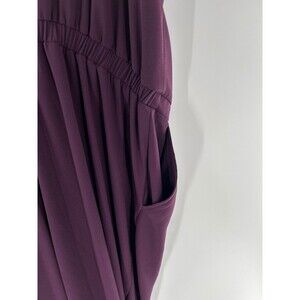 Up for sale is a purple jumpsuit that has a pocket on each side. Ties in the back. Flutter sleeves. There is also elastic in the back of the waist