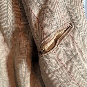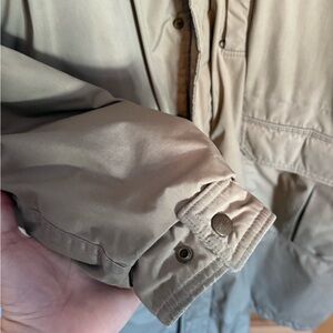 Vintage beige wool lined jacket with zipper and button closure. Features multiple pockets for convenience. Heavyweight and versatile. XL or XXL (size tag missing)