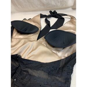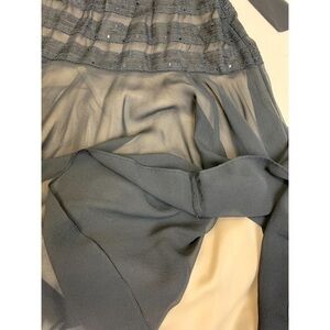 Low cut front with halter straps that tie at neck- hidden back zip - nude underlay- black sequins on top add subtle sparkle- fitted on top and flowing chiffon bottom -hem is different lengths, measurement from under bust to lowest part of hem is 40” - bra cups sewn in (could easily be removed) - gently worn, no flaws- 100% silk