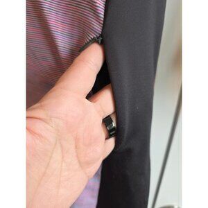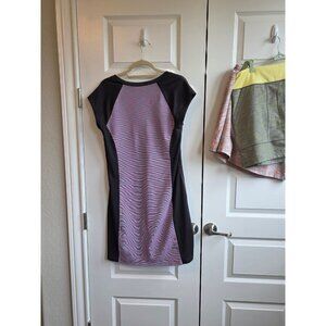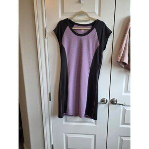 Short-sleeve athletic dress (purple/black colorblock) — hidden side zip pocket, fitted yet comfortable