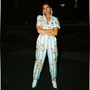 RVCA Nightshift Floral Denim Jumpsuit For Women Pink White Blue Size M
