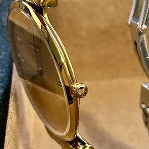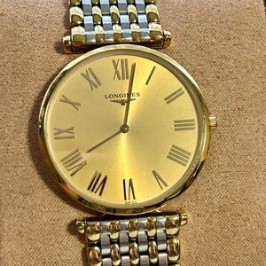 Stylish Longines watch with a gold dial. Features a two-tone gold and silver bracelet. Ideal for any event.