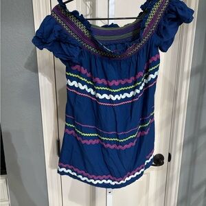 This gorgeous dress by Red Carter sold at Anthropologie features an off-the-shoulder design with rickrack trim to add a bohemian touch. The dress is a size small and has short sleeves, making it perfect for casual wear, parties, and even travel. It has a mini length and comes in a beautiful blue color that will complement any style. The brand is known for its high-quality products, and this dress is no exception.